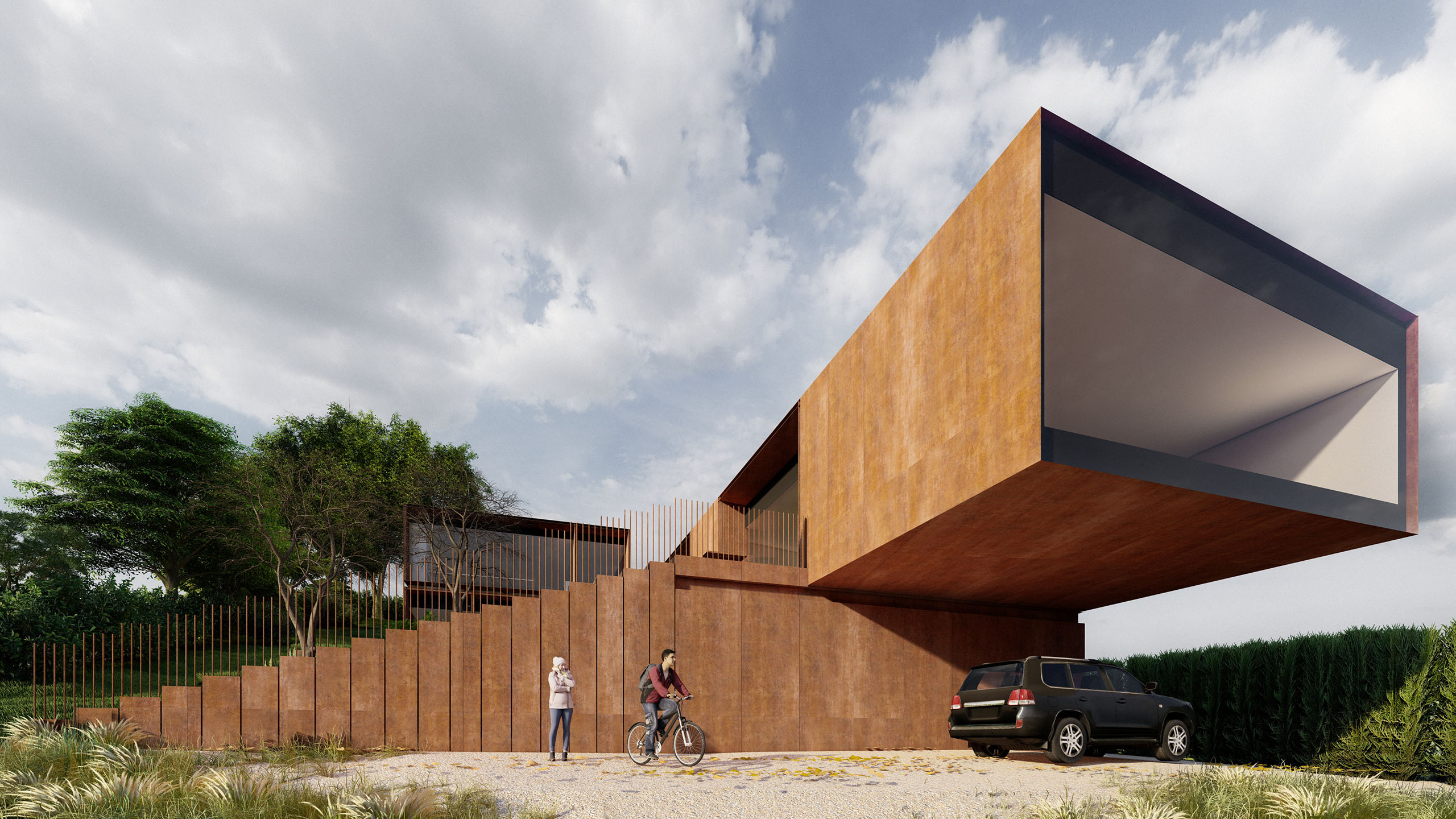 The steep slope across the site has informed the design of a series of terraced landscaped areas, seamlessly connecting the home to its surroundings while creating dynamic outdoor spaces. The exterior is clad in weathered steel, a material chosen for its rugged beauty and ability to age gracefully, echoing the earthy tones of the surrounding environment.
